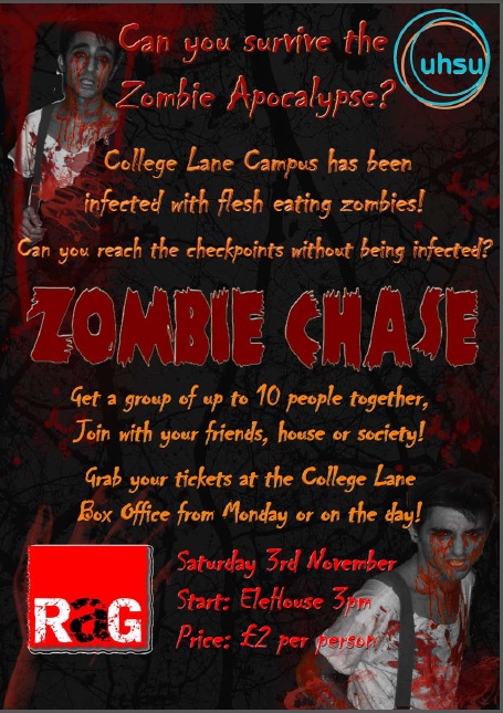The Zombie Chase was my favourite of the RaG events through 2012-2013. Getting dressed up and chasing students around campus was unbelievably fun, and seeing so many people come together to make the event a success really embodied what RaG is about.